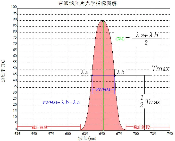FWHM——Transmittance is the wavelength width that is half the peak transmittance, i.e. bandwidth